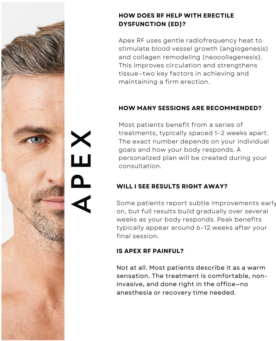 You don’t have to settle for short-term fixes. APEX RF offers a modern, clinically backed option to restore confidence, intimacy, and quality of life.